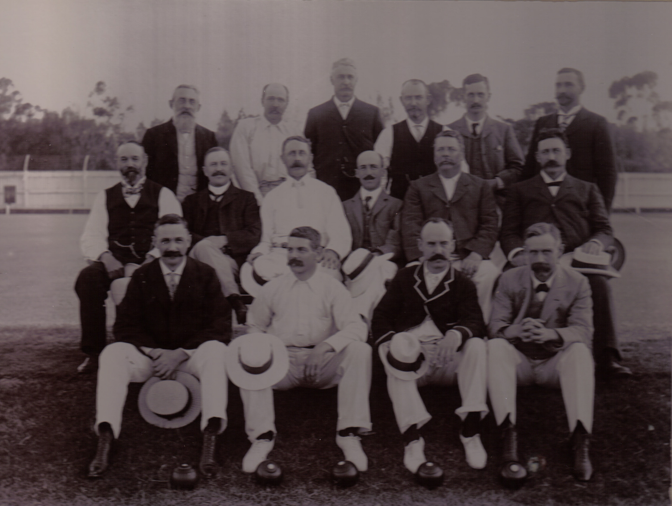 William Hall Henderson is at the front, second from the right. The teams were J. Jude, L.P. Lawrence, W. Hall Henderson and John Hill (Captain); W. J. P. Davies, W. Saunders, A. F. Browne and R. J. Hawkes (Captain); W. L. Davidson, John Creswell, A. M. Pettinger and H. D. Sutherland (Captain); H. K. Wendt, F. T. Bridges and S. J. Asher (Captain)