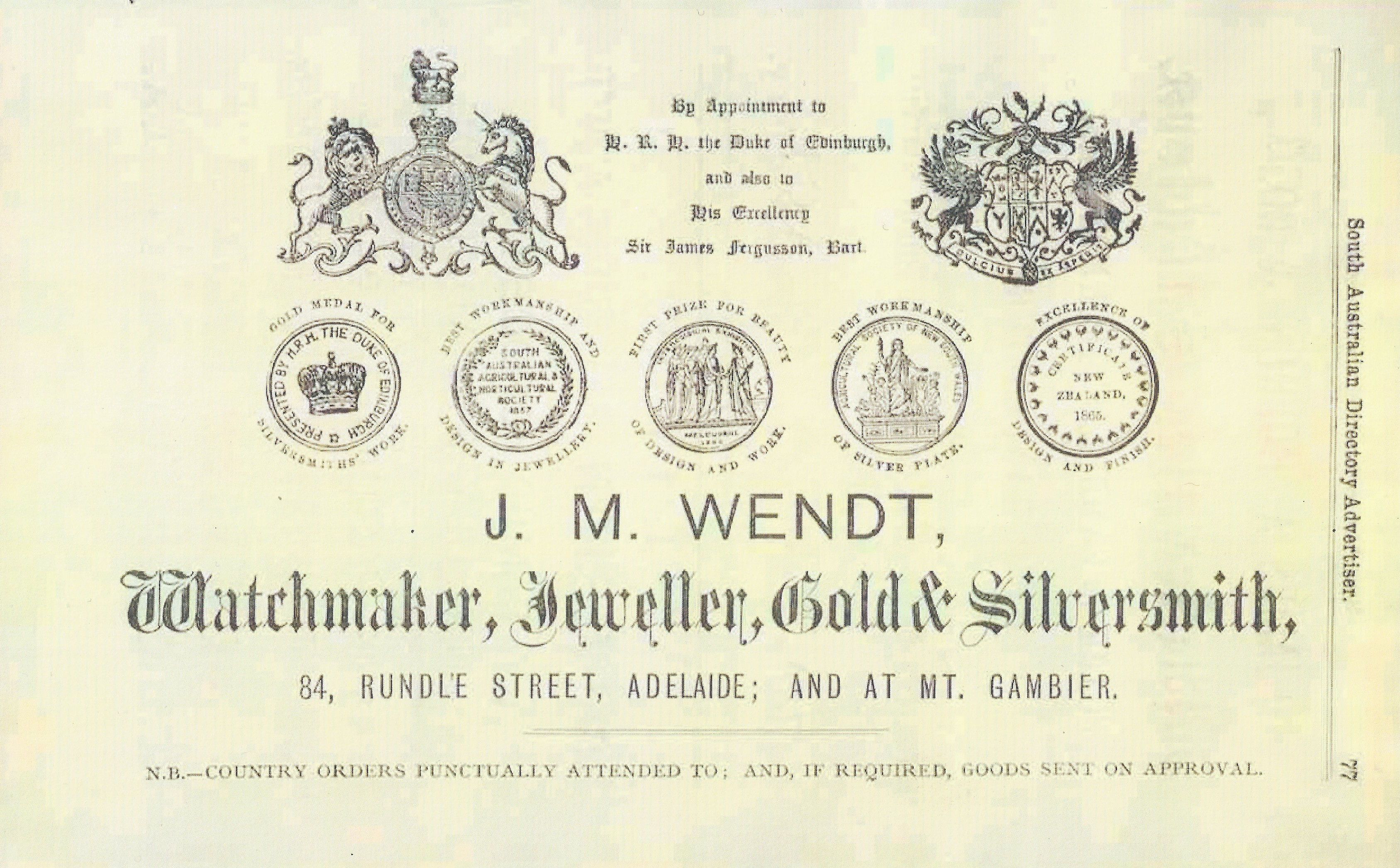 1. Wendts Jewellers Advertisement, 1889. This advertisement for Wendts Jewellers appeared in the South Australian Almanac of 1889