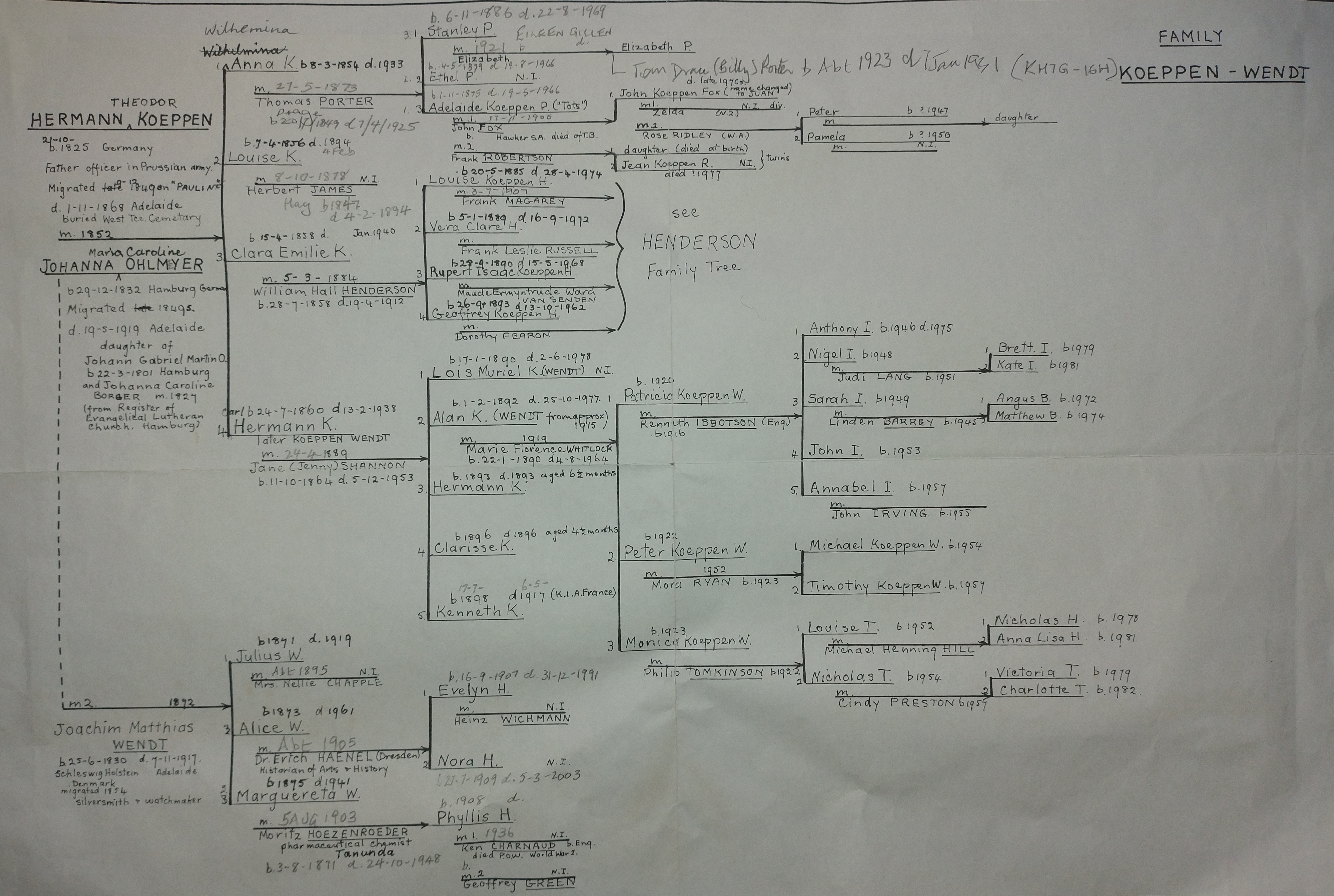 3. Koeppen Wendt Tree: Original Tree drafted by Barbara Rounsevell in 1983, 1983, Unknown. This is the original tree and clearly shows the link from Koeppen to Wendt after the death of Johanna Koeppen's (nee Ohlmeyer) original husband Hermann Koeppen and subsequent marriage to Joachim Wendt.