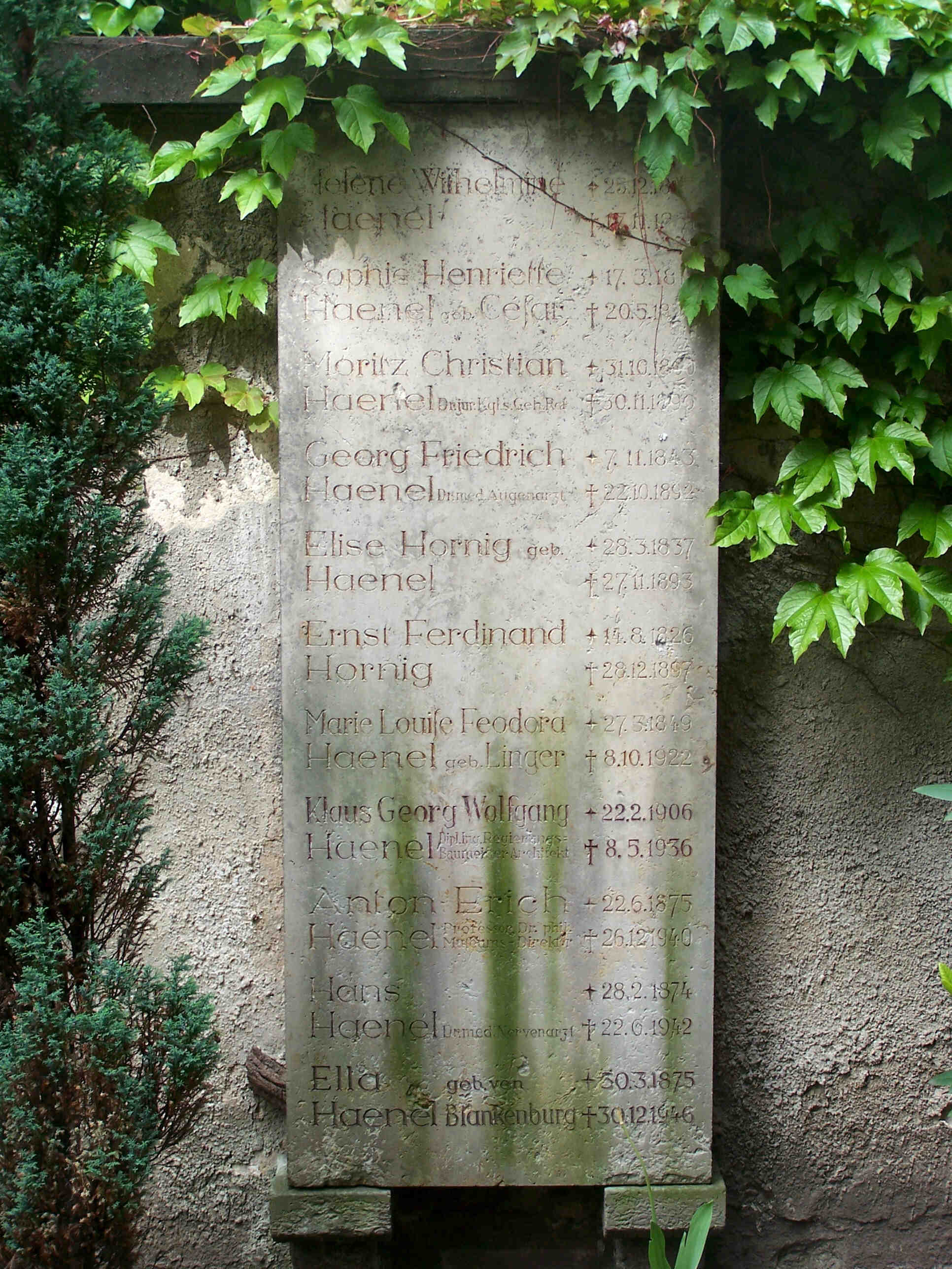 2. Memorial: Anton Eric Haenel (3rd from bottom) appears on family memorial plaque in Dresden, Abt 1946, Dresden, Germany. Anton married Alice WENDT, daughter of Mr Joachim Matthias WENDT and Johanna Maria Caroline OHLMEYER, about 1905 in Adelaide, South Australia. (Alice WENDT was born in 1873 in Adelaide, South Australia and died in 1961 in Adelaide, South Australia.) |