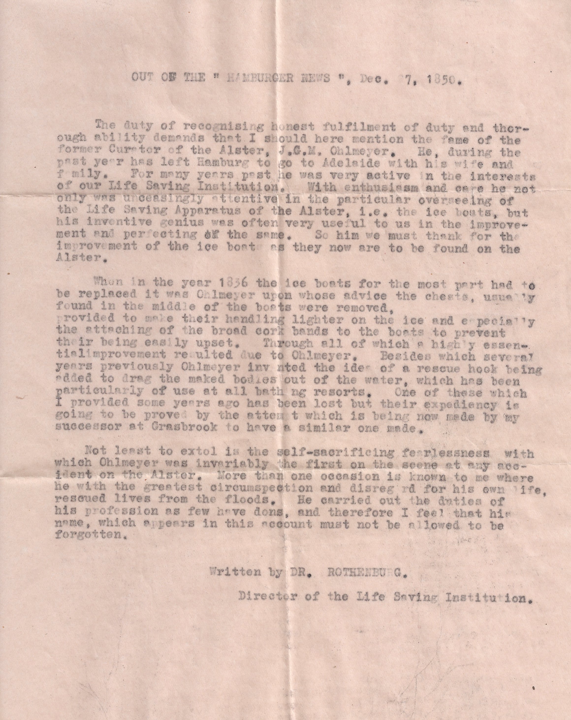 The duty of recognising honest fulfilment of duty and thorough ability demands that I should here mention the fame of the former Curator of the Alster, J.G.M Ohlmeyer. He, during the past year has left Hamberg to go to Adelaide with his wife and family. For many years past he was very active in the interests of our Life Saving Institution. With enthusiasm and care he not only was unceasingly attentive in the particular overseeing of the Life Saving Apparatus of the Alster, ie the ice boats, but his inventive genius was often very useful to us in the improvement and perfecting of the same. So him we must thank for the improvement of the ice boat as they now are to be found on the Alster.